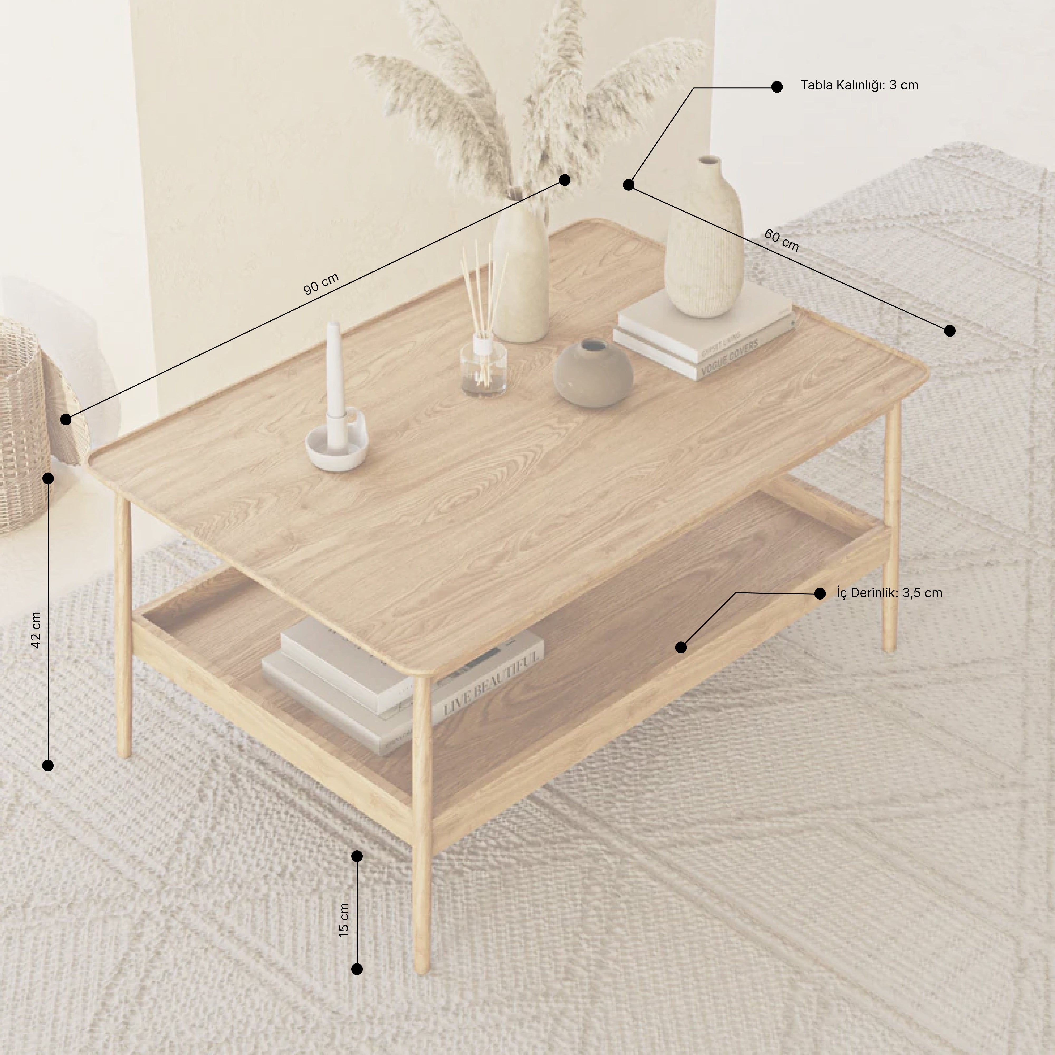 İki katlı yapısıyla tasarlanan Herb ailesi, alt rafı sayesinde kitaplarınızı, dergilerinizi veya dekoratif objelerinizi düzenli bir şekilde sergilemenize olanak tanır. Bu fonksiyonel tasarım, günlük yaşamınızı kolaylaştırır.