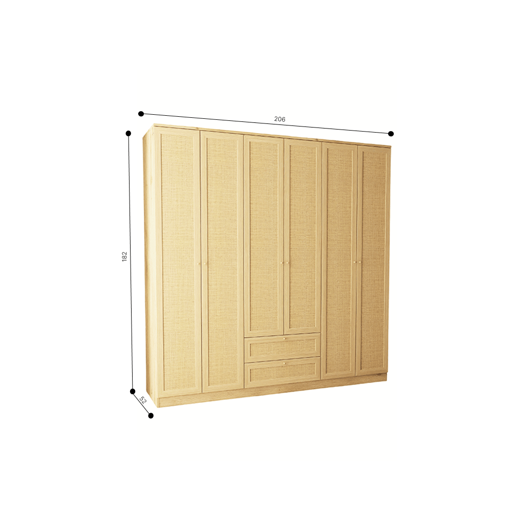Evinize hem doğal bir sıcaklık hem de zarif bir karakter kazandıracak bu 6 kapaklı gardırop, modern çizgileri ve hazeran detaylarının kattığı özgün dokuyla öne çıkar. Açık tonlardaki ahşap yüzeyi ile el işçiliği hissi veren hazeran kapaklar, yatak odanıza hem bohem hem de minimalist bir hava kazandırır. Geniş iç hacmi sayesinde kıyafetlerinizi düzenli şekilde saklamanıza olanak tanıyan Klint gardırop, hem estetik hem de işlevsel yapısıyla yaşam alanınızda şık bir bütünlük oluşturur.