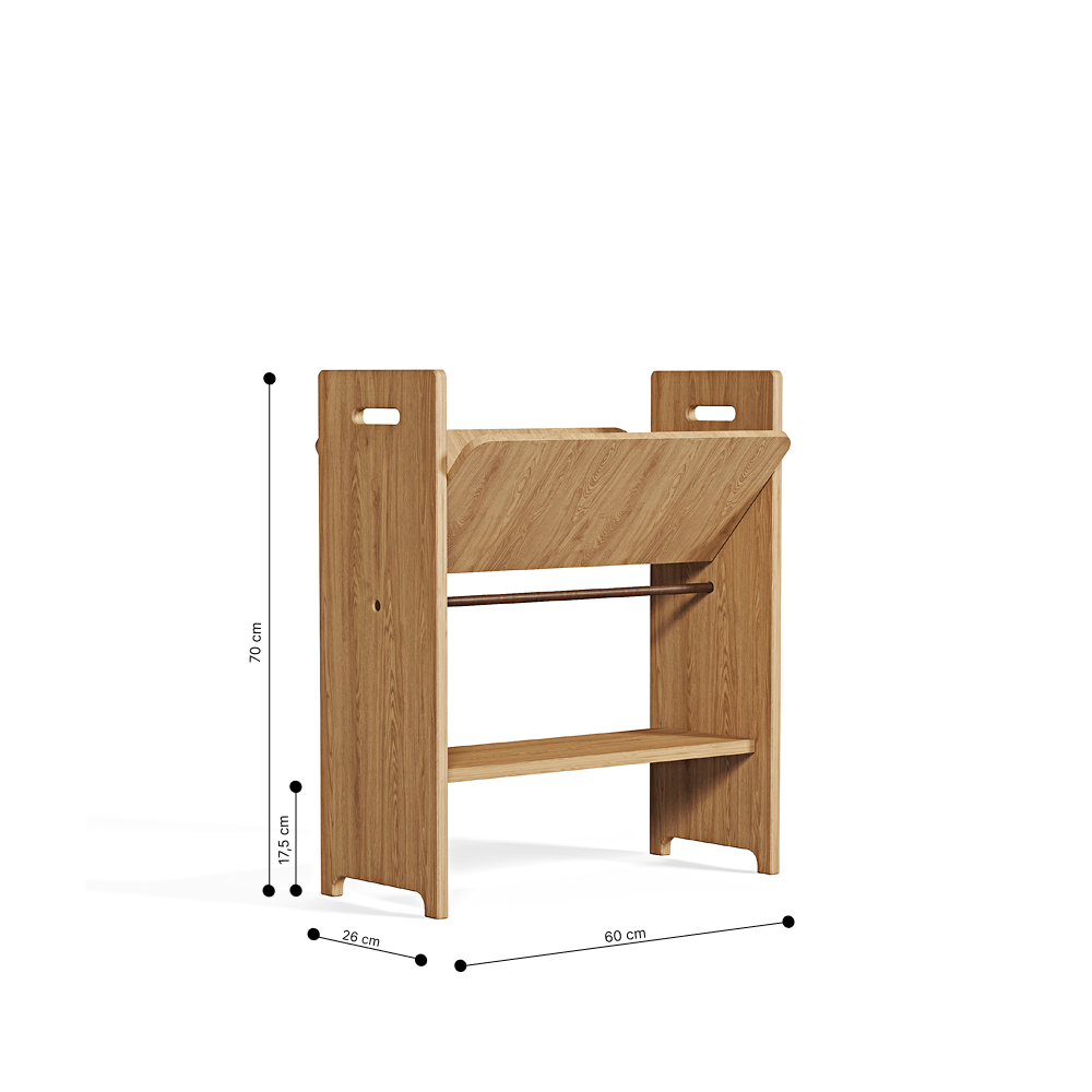 Meşenin doğal dokusunu öne çıkaran zarif çizgiler, hem modern hem de klasik dekorasyonlara uyum sağlar. Dergi, gazete ve kitaplarınızı düzenli tutmanın yanı sıra, estetik görünümüyle evinizde hem işlevsel hem de dekoratif bir unsur haline gelir.